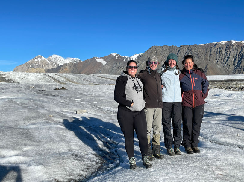 Description: Installing ablation stakes in debris covered ice (circular frames) to measure the melt under debris of different thicknesses in July 2022. Right: Alanna Dickson (left) and Kristy Kennedy (right) joined the SFU Glaciology Group (Gwenn Flowers & Katie Robinson) at the end of August 2022 to help collect data from the debris-ablation experiment.